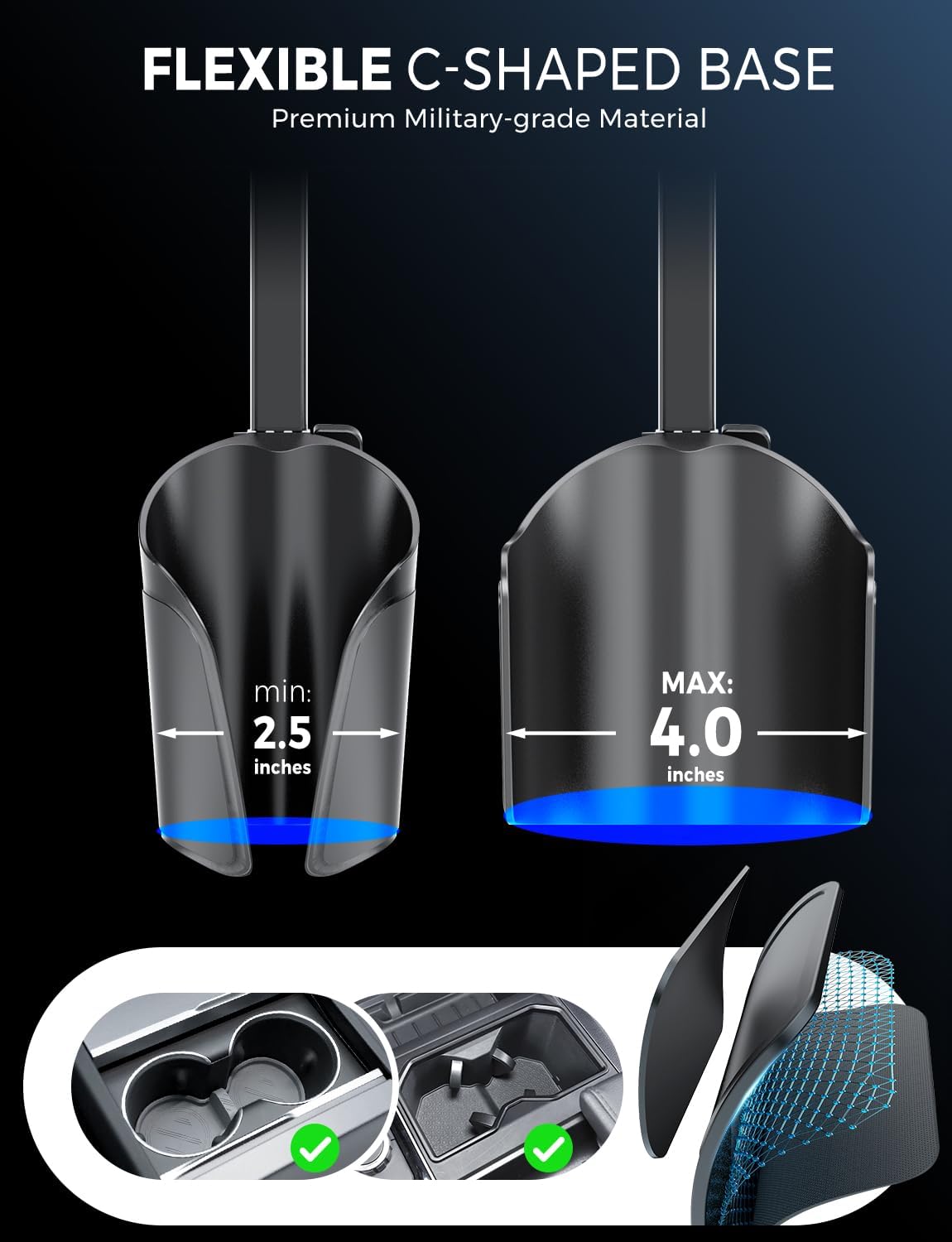 【Rock-Solid Cup Holder Mount】 Its flexible C-shaped base, made of an elastic, engineered material, adapts to securely grip your car’s cup holder, locking your phone in place with exceptional stability. Unlike bulky dashboard car phone mount, our eSamcore cup holder phone mount stays low-profile—never blocking your vision or car air vents!