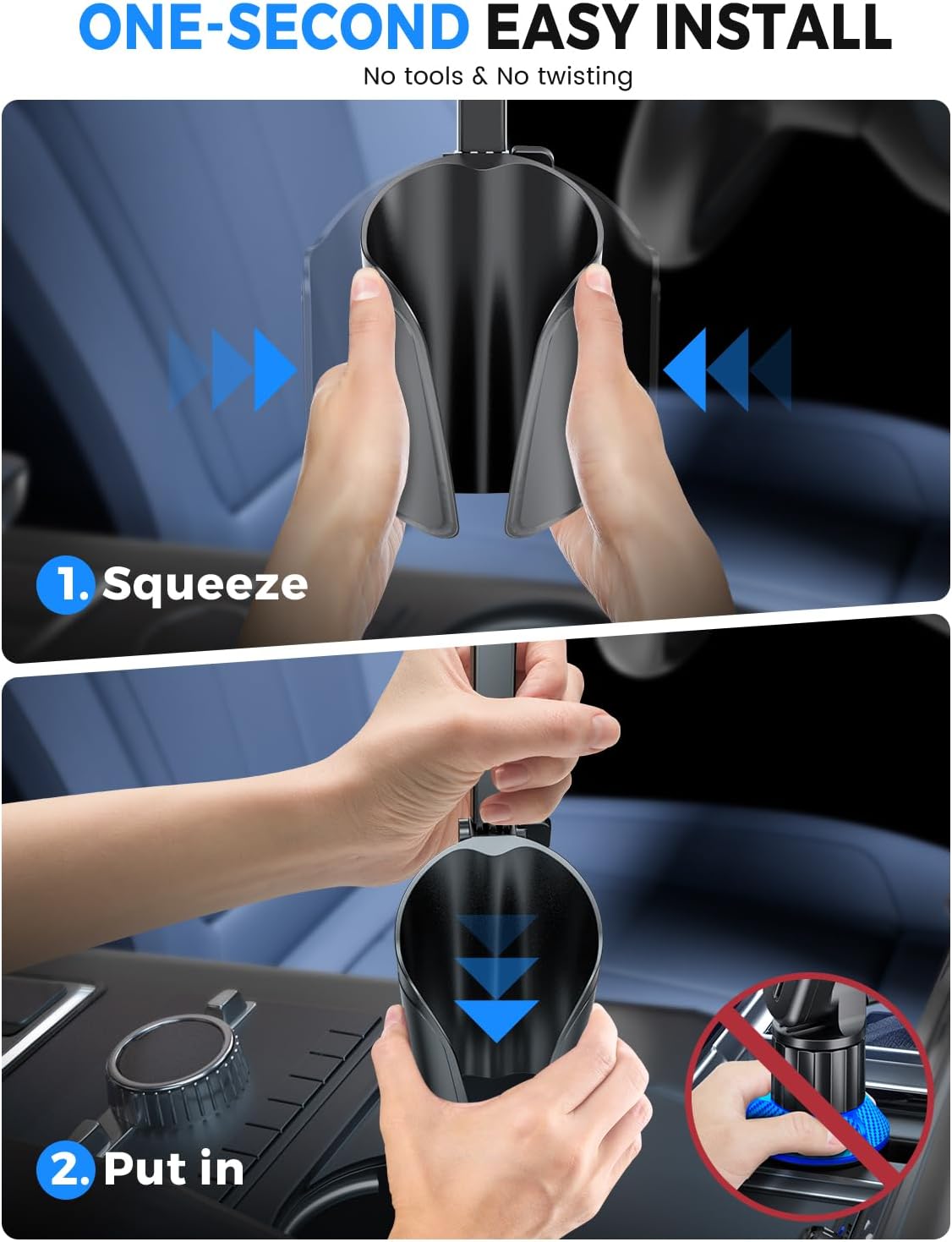 【Instant One-Second Install】Just squeeze and drop into your cup holder—zero tools or twisting needed! Skip frustrating nut-tightening of old-school mounts. Fits round or most square holders (2.5″-4″). Our eSamcore car phone holder matches your car’s vibe with a sleek, low-profile look.